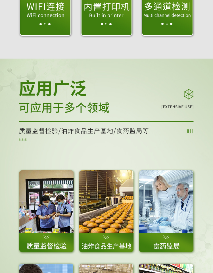广泛应用于质量监督检验、工商管理、油炸食品生产基地、食药监局、卫生部门、肉制品食品深加工企业、商场超市、各大食品安全监测系统等单位使用。